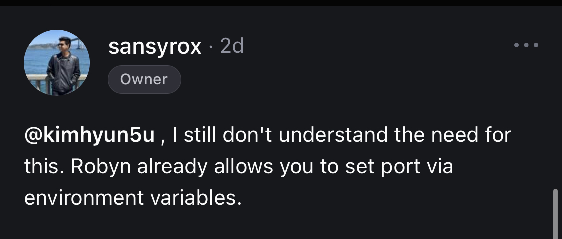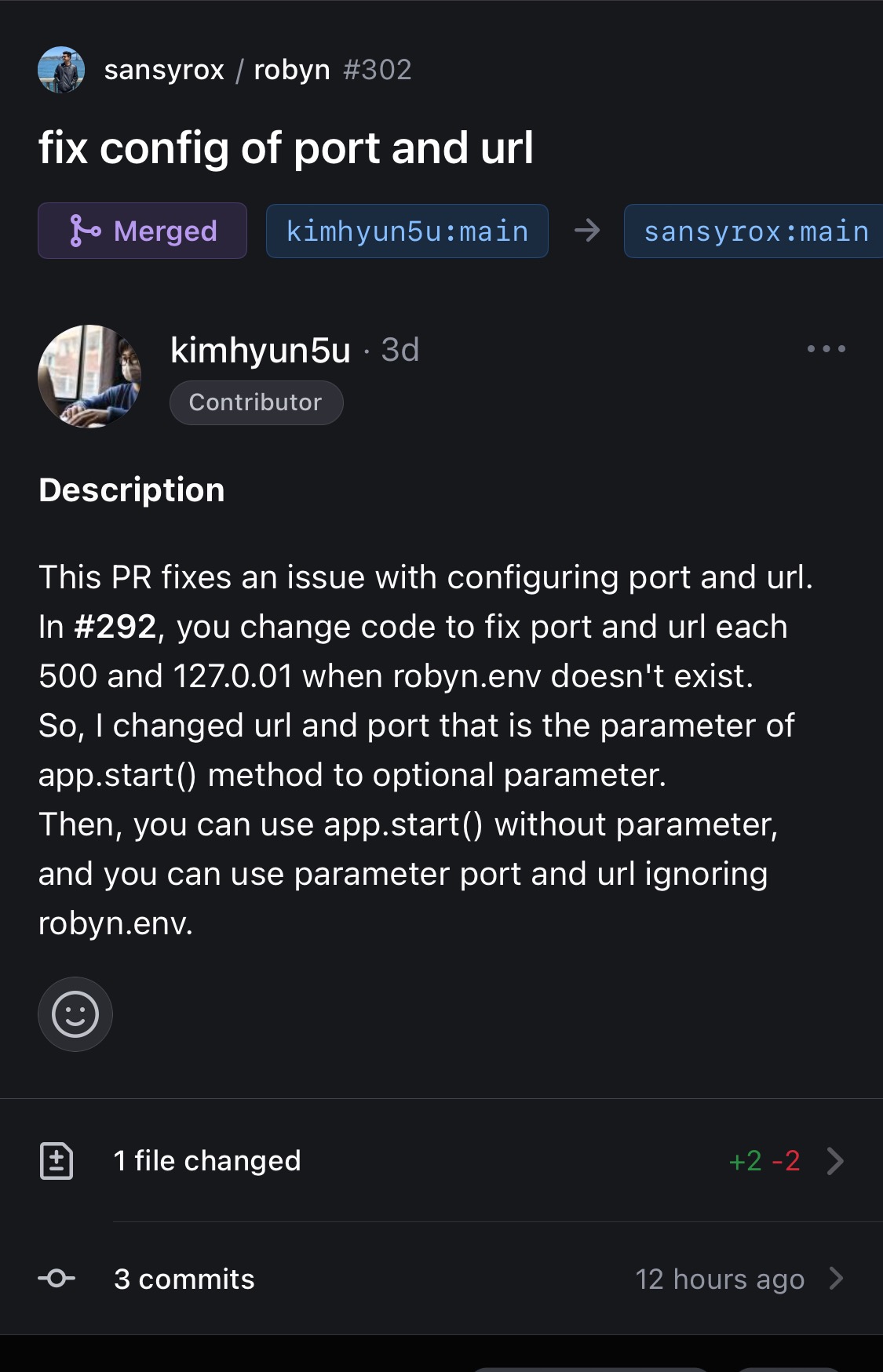 스타가 1.6k 나 되는 프로그램이 이렇게 짜여있다는게 이상해서 코드를 살펴보니 22일전 robyn 앱의 설정을 robyn.env 으로 할 수 있도록 기능을 추가했는데 그 과정에서 오류가 발생했던 것 이었다. 하지만 이 기능은 문서에서 설명하고 있지 않았고 robyn.env 을 통하지 않으면 포트와 호스트 설정을 할 수 없었다.