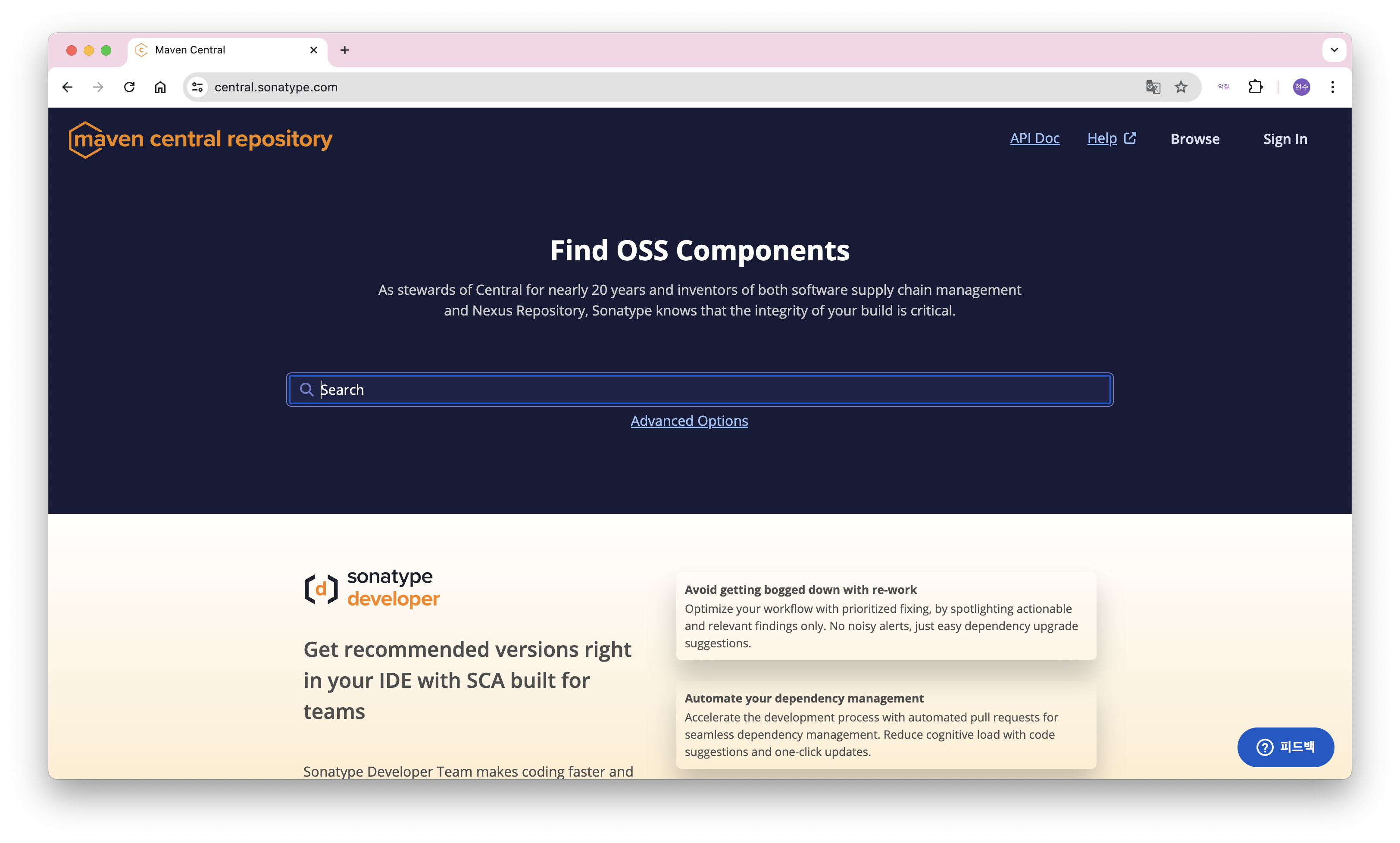 Maven Central Repository는 Java 개발자들이 가장 많이 사용하는 공개 아티팩트 저장소입니다. 이 저장소는 수많은 오픈 소스 Java 라이브러리, 프레임워크, 그리고 도구들을 호스팅 하고 있습니다. Sonatype이 운영하며, Apache Maven 프로젝트의 공식 저장소로 인정받고 있습니다.