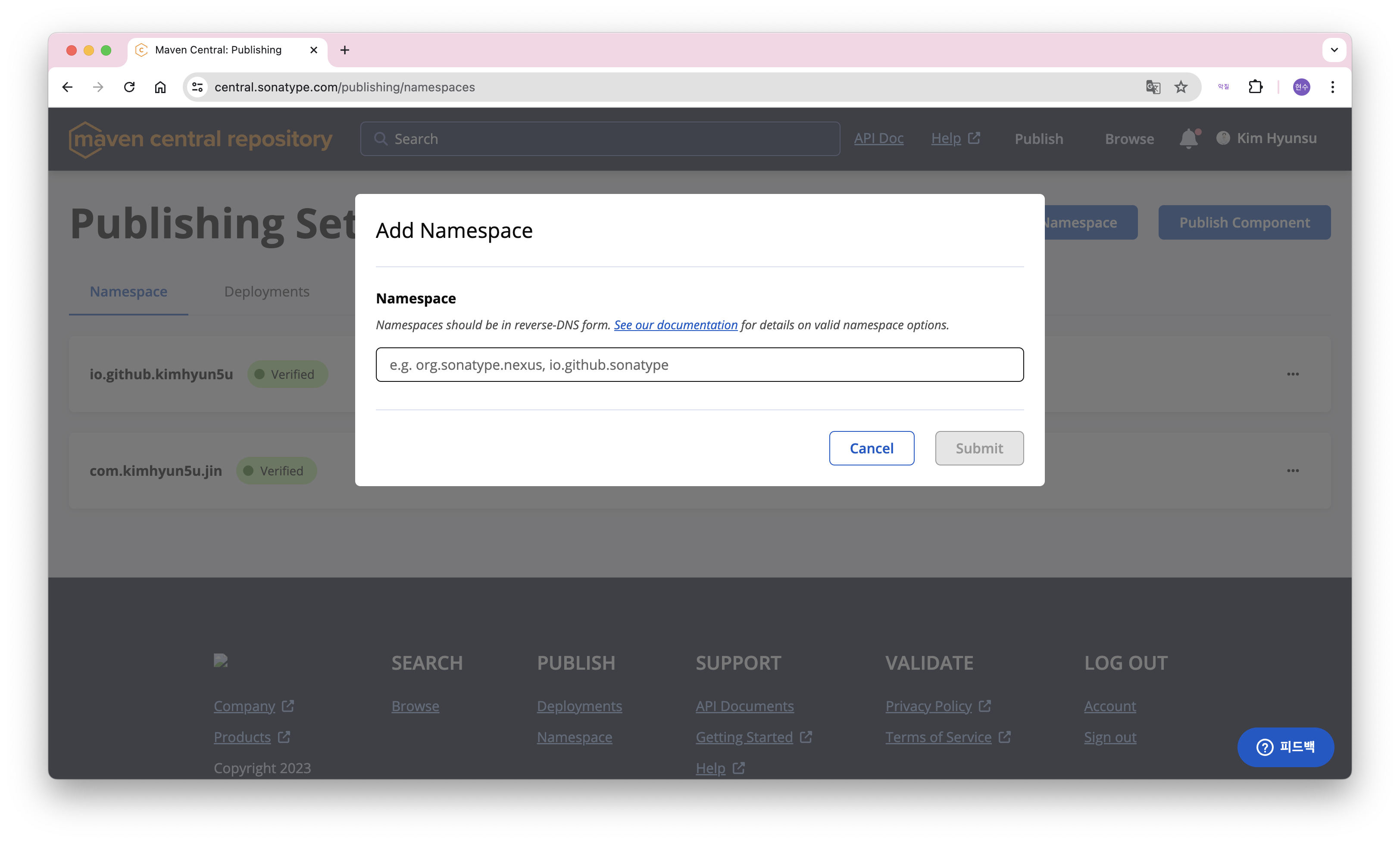 다음은 Namespace 등록입니다. 이 단계는 2가지의 경우가 존재하는 데 사용하고 있는 도메인을 통한 방법과 github 같은 code hosting service 서비스를 이용하는 방법이 있습니다. 로그인 후 오른쪽 상단의 publish -> add namespace를 누릅니다.