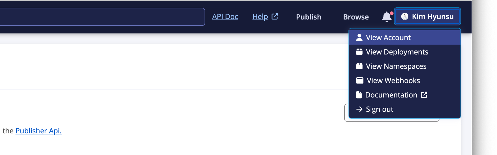 다음은 Namespace 등록입니다. 이 단계는 2가지의 경우가 존재하는 데 사용하고 있는 도메인을 통한 방법과 github 같은 code hosting service 서비스를 이용하는 방법이 있습니다. 로그인 후 오른쪽 상단의 publish -> add namespace를 누릅니다.