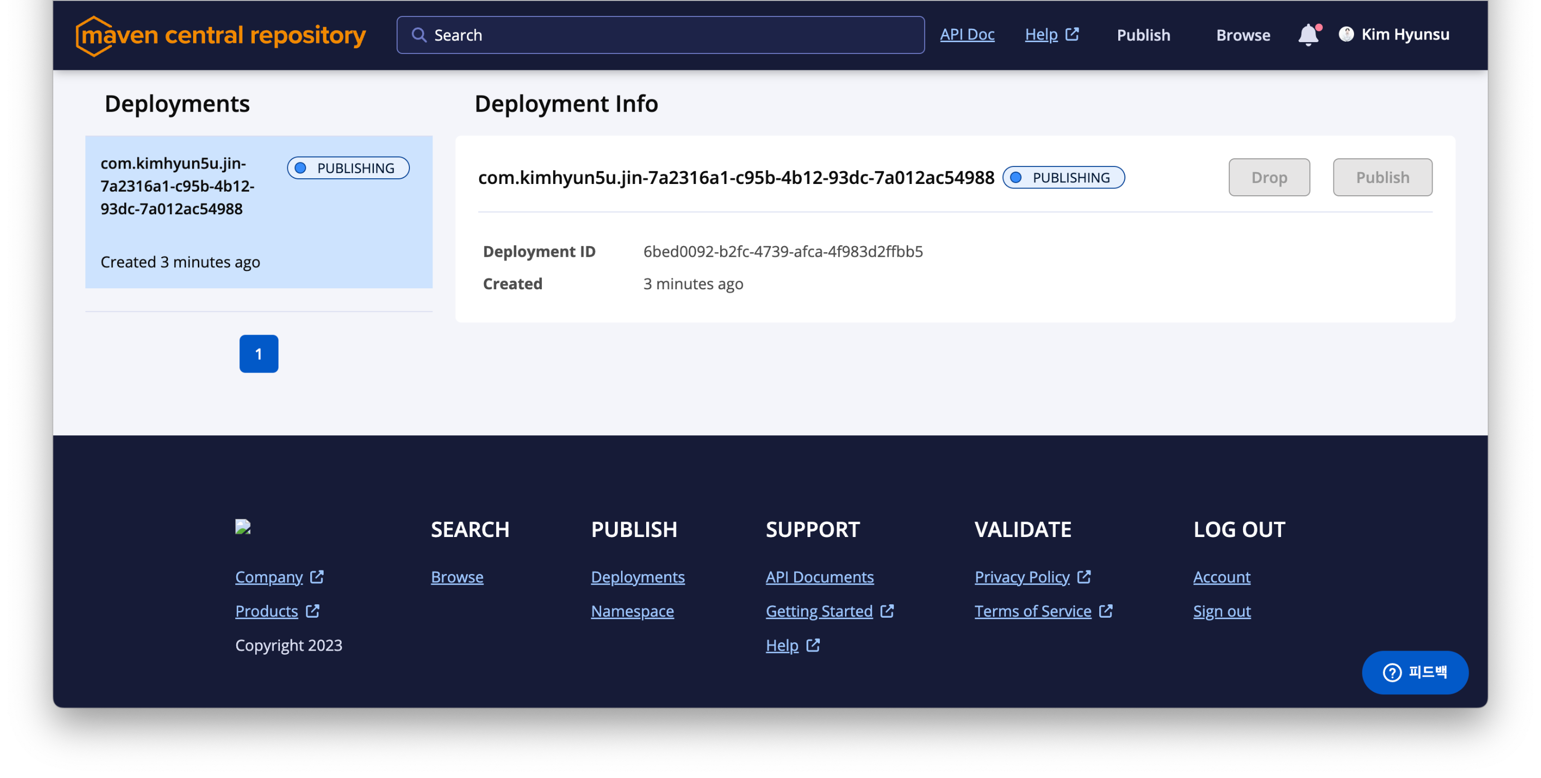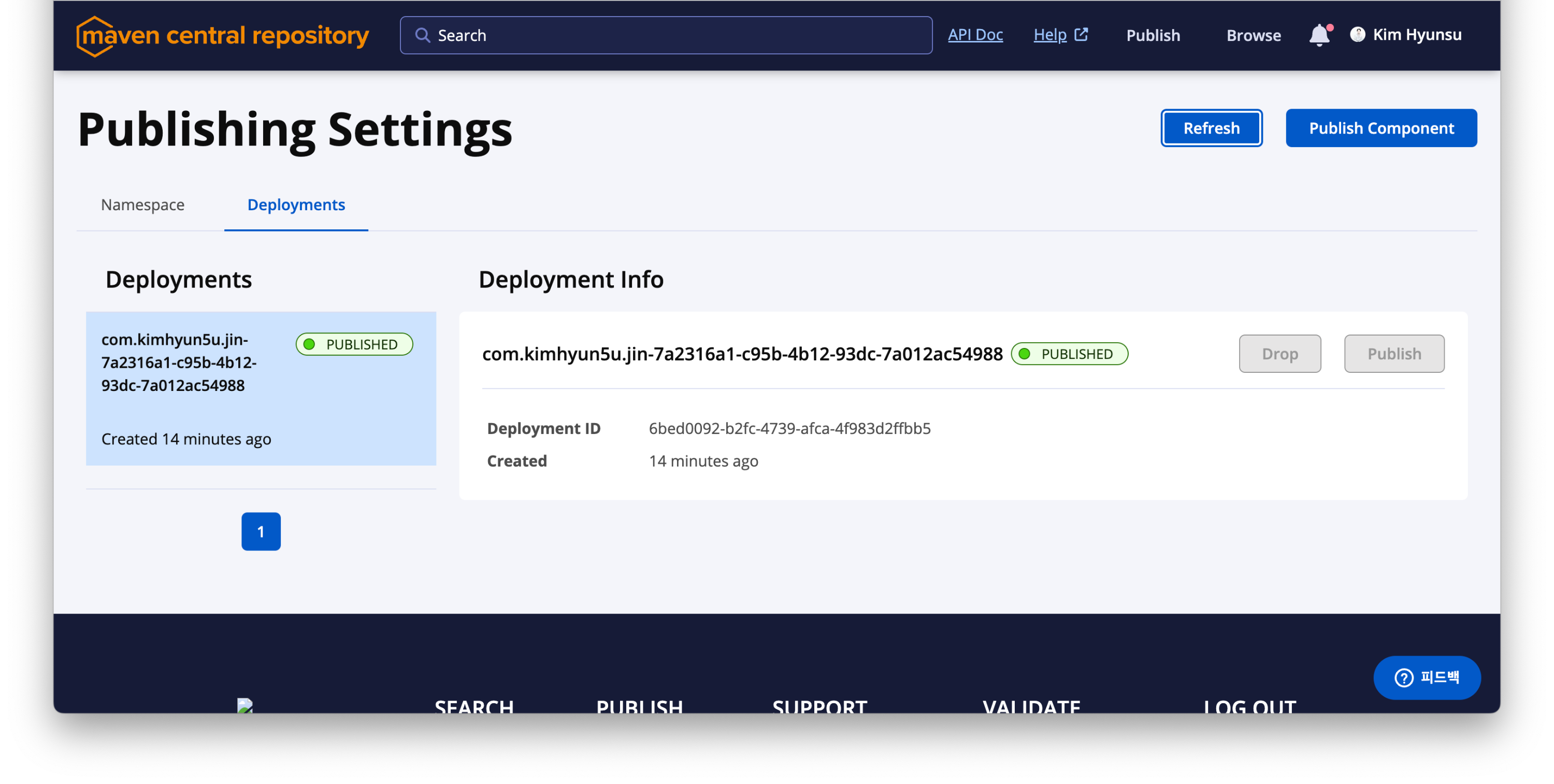 ./gradlew publishAllPublicationsToMavenCentralRepository빌드가 성공했다면 다시 central.sonatype.com/publishing으로 돌아가면 Deployments에 배포되고 있는 프로젝트를 볼 수 있습니다.