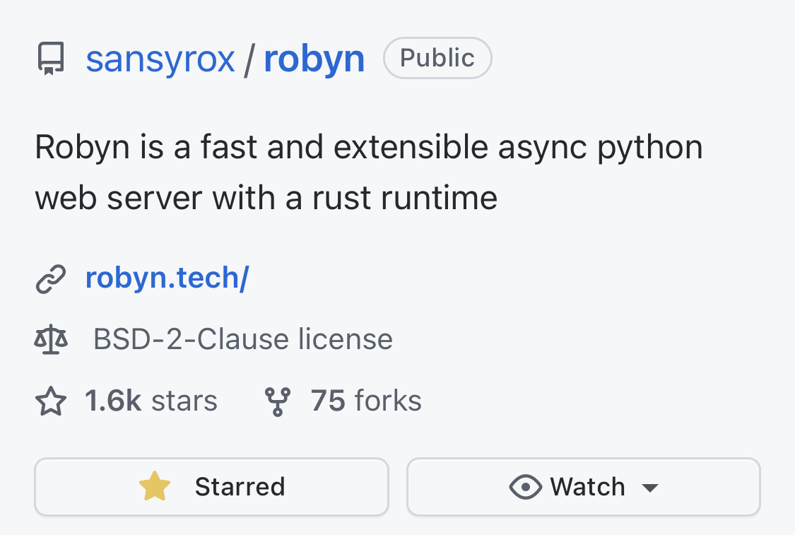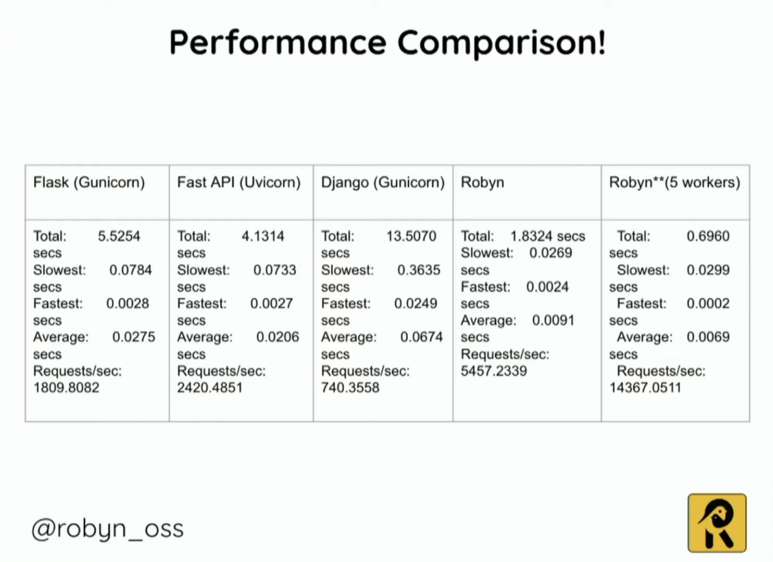 우선, robyn 은 rust 런타임 의 비동기 파이썬 백엔드 프레임워크이다. 다른 파이썬 백엔드 프레임워크보다 훨씬 빠른 장점이 있다.