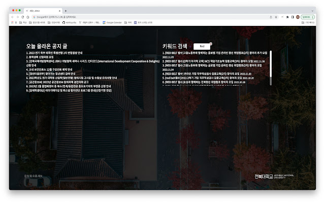 JBNU 새탭을 사용하면 아래와 같이 새 탭을 열 때마다 오늘 올라온 공지와 지정한 키워드의 공지를 확인할 수 있다.