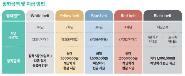 큰사람 프로젝트 장학금액 '큰사람 프로젝트'만 매 학년 이수해도 현금 550만원을 받을 수 있다.(1학년 white 벨트를 제외하고 모두 현금 지급된다)