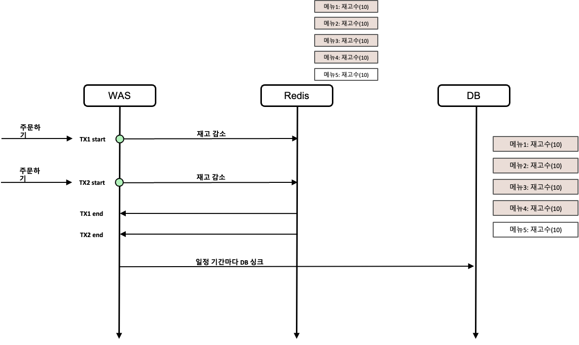 저희 서비스는 주문을 하기 위해서는 카트를 담는 행위가 선행되어야 하기 때문에 카트에 담을 때 재고를 redis에 동기화 해주었습니다.